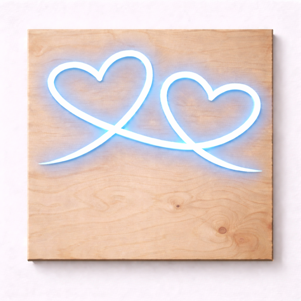 Artfully handcrafted on a premium wooden board, this Intertwined Hearts LED Flex Wall Art features a smooth, flowing continuous-line design symbolising connection, love, and unity. The elegant heart forms glow softly, creating a warm and inviting atmosphere that feels calm, romantic, and thoughtfully designed.